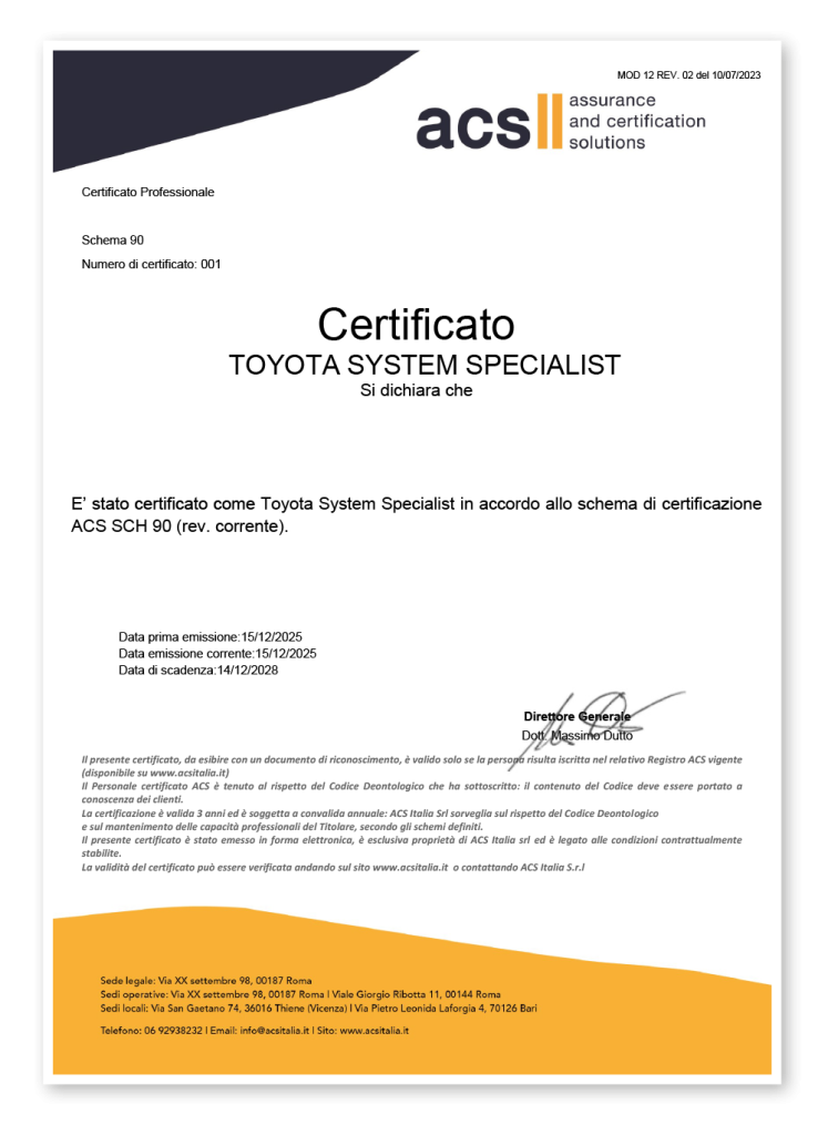 La certificazione Toyota System Specialist attesta la capacità di applicare questi principi nella pratica: mappare i flussi reali, leggere le cause profonde delle inefficienze, progettare stati futuri credibili e accompagnare le organizzazioni nel cambiamento, passo dopo passo.